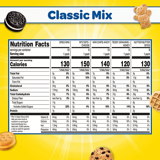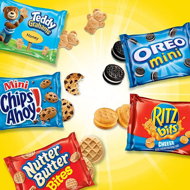 Includes 10 OREO, 10 CHIPS AHOY!, 8 Nutter Butter, 6 RITZ, 6 Teddy Grahams