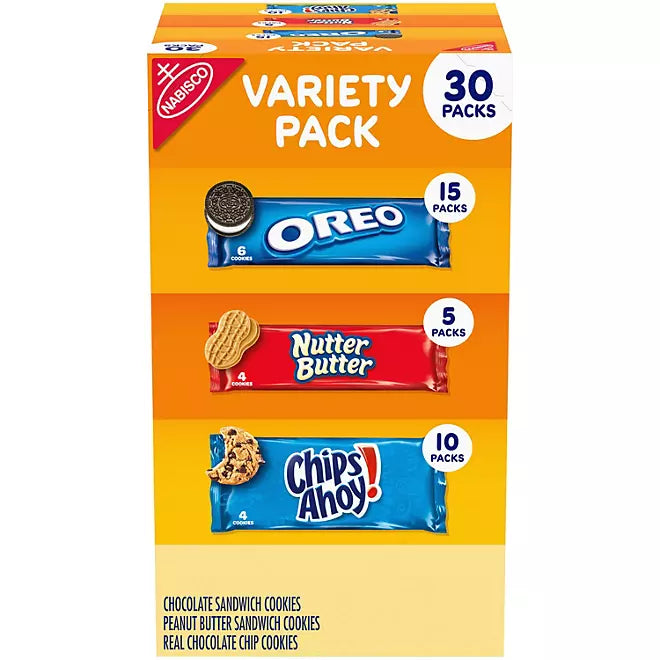 Individually packaged for easy storage.Make your next party a hit with this Nabisco Cookie Variety Pack including OREO Original, Nutter Butter and CHIPS AHOY! cookie snack packs. These assorted cookies have delicious flavors in convenient packs. OREO cookies have the same original creme filling between chocolate cookies you love with six cookies in each pack. CHIPS AHOY! cookies are crunchy and packed with chocolate chips for a tasty snack with four cookies in each pack. Nutter Butter Peanut Butter Sandwich Cookies have a smooth peanut butter cream filling for satisfying sweetness with a touch of saltiness in every one of the four cookies in each pack. They are great for on the go; grab them for a quick snack, take them on a road trip or have them ready for the holidays. Include these assorted snacks in your lunchbox to brighten the day, or tuck a pack into your purse or briefcase for a quick nibble in between meetings. This cookie mix offers great variety in flavors and tastes so it would make a great addition to any concession stand, foodservice station, convenience store or vending machine. These bulk cookies include 15 OREO Original, 5 Nutter Butter and 10 CHIPS AHOY! lunch snacks. Each of the individually sealed cookie snack packs locks in freshness and is perfectly portioned for gatherings, lunchboxes, road trips and more.