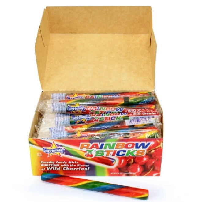 Atkinson Red and White Mint Stick Candy - 36 per pack -- 12 packs per case. These perfect bite sized peppermint Mint Twists are a staple of candy dishes around the country for their refreshing crisp flavor. Mint Twists are made with the champagne of peppermint oils, menthe piperita. We start with small batches of natural sugars and add all natural peppermint oil no artificial ingredients here. Then, our skilled confectioners hand make our trademark red and white stripes before we individually twist wrap each delicate piece. MintTwist 240CtJarFor the finest in handmade peppermints our Mint Twists are always in style. Both our classic Mint Twists sticks and bite sized pieces are perfect for candy dishes or tossing into your purse or pocket any day. Made with the All Natural Champagne of Peppermint Oils Small Batch Handmade Artisan Peppermint Candies Zero Fat, Zero Cholesterol, and Zero Sodium Vegan Friendly Gluten Free Kosher Certified Kosher. Atkinson Rainbow Candy Stick in wild cherry flavor