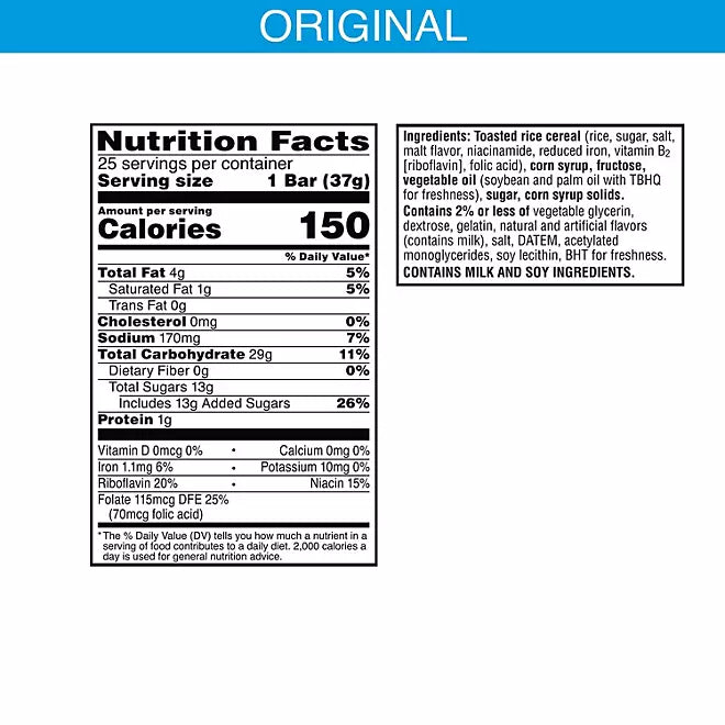 Kellogg's Rice Krispies Treats are a simple, classic snack. It's one of the country's favorite sweet treats. Each bar is individually wrapped and ideal for taking along to work, school or while running errands. Bite into one of these chewy, gooey snacks to satisfy a sweet tooth.Rice Krispies bars are made with a blend of toasted rice cereals, sugar and milk. They're as fun to share as they are to eat. They aren't a significant source of calories or fat and are free from cholesterol while providing a dose of riboflavin, niacin and folate.